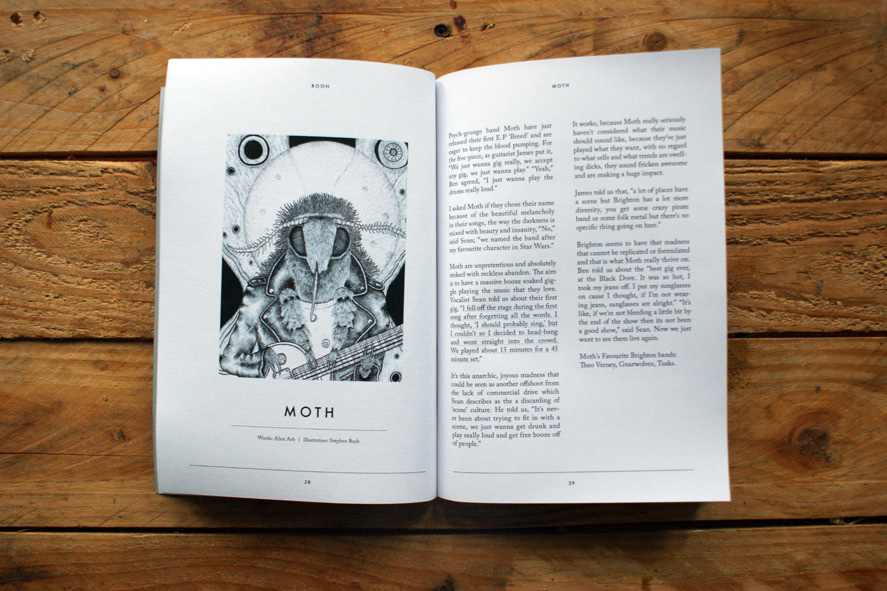 Four illustrations used in Issue four of Boon Magazine (http://www.boon-magazine.co.uk/), a Brighton based free arts and culture quarterly. I was given a arcticle reviewing the latest crop of emerging talent on the Brighton music scene, which included the bands Tusks, Moth, Vyypers and The Magic Gang. As three out of the four band names were related to animals I decided to run with the theme of animal band members. When asked to visualise their sound by the magazine 'The Magic Gang' depicted a manatee, which I ran with for my own illustration.